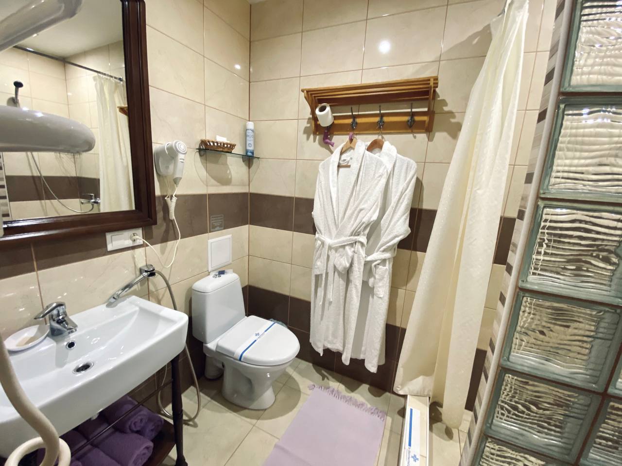 • Просторная душевая комната с феном и полотенцами